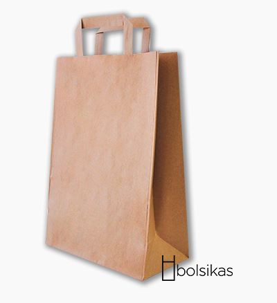 Bolsa de papel kraft con asas planas tamaño S. La medida de bolsa 24+11x34. Bolsa fabricada en papel reciclado 100% de 80 grs/m2. Fabricado en España. Una caja de 250 unidades.